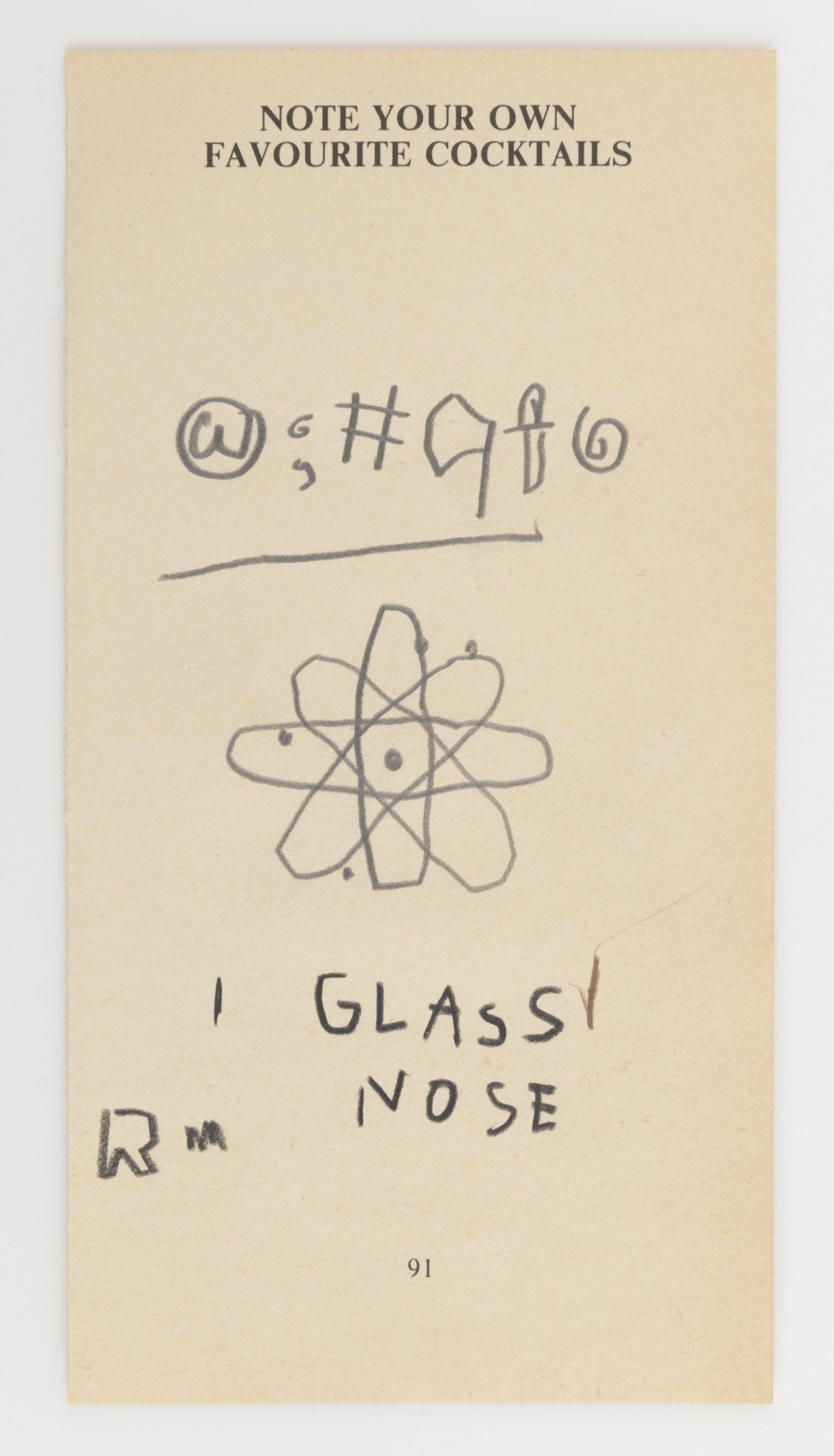 Untitled (Page 90) and Untitled ( |GLASS | NOSE), 1986, by Basquiat are two pages of Harry’s ABC linked by a related subject, the image of a hatted figure eating a banana on page 90 that is compositionally related to Basquiat’s vivid painting of the same title, Glass Nose, 1987, and the text “GLASS NOSE ” drawn on page 91. These works seem to refer to the Russian political policy, Glasnost, initiated by Mikhail Gorbachev in 1986, with the work on page 90 possibly including letters of the Cyrillic alphabet. Basquiat’s drawing of the atomic symbol on this page adds to the heightened awareness of Cold War politics and the dangers thereof, when the threat of nuclear war led to a sense of national urgency.