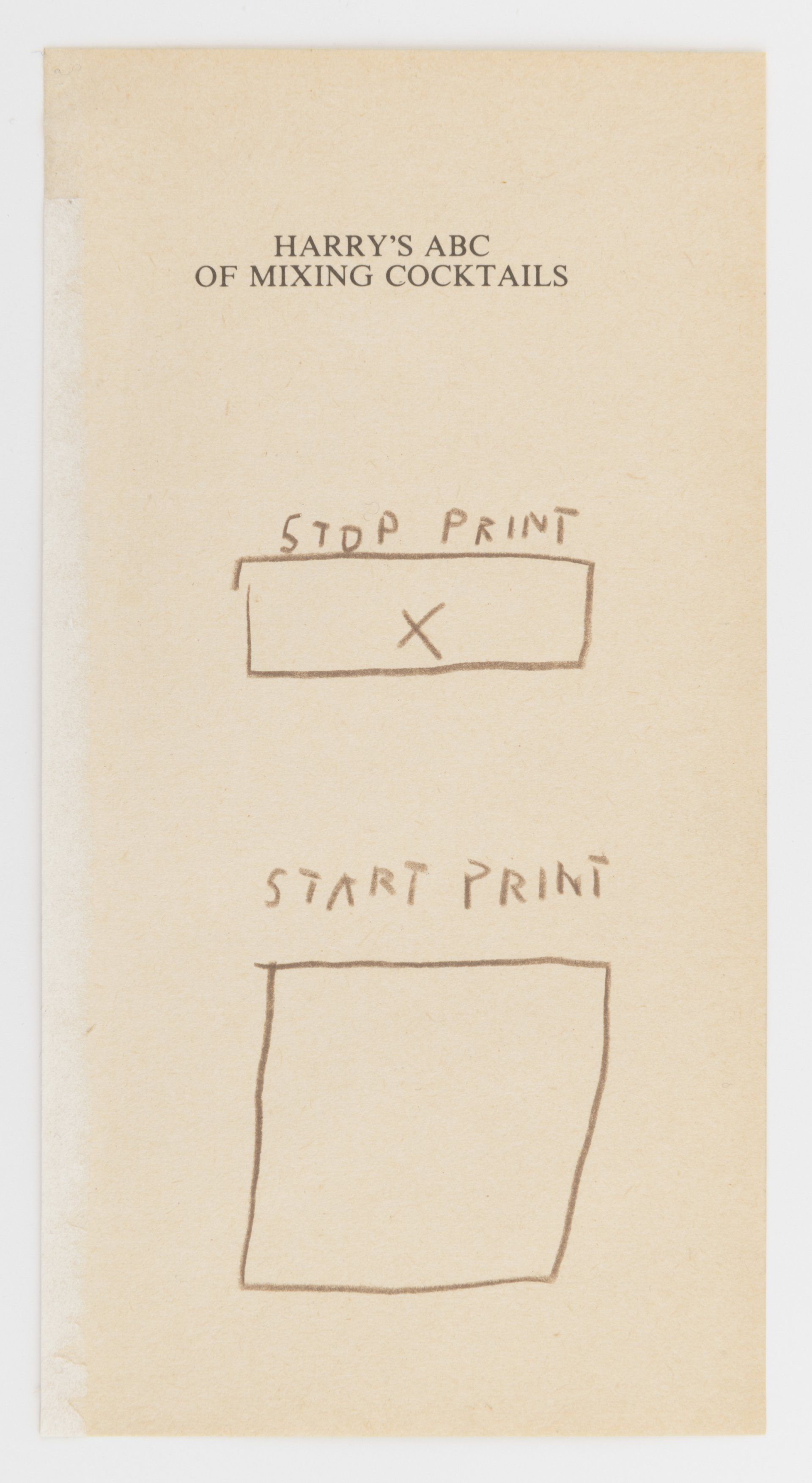 With simple graphics and text – one rectangle, one square, one “X”, and the imperatives, “STOP PRINT” “START PRINT” – Basquiat’s drawing on the frontispiece of Harry’s ABC captures the action of one of his vital artistic tools, a machine of reproduction most frequently known as the Xerox photocopier.